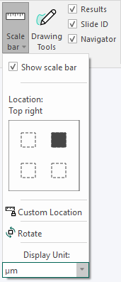 The scale bar box in the corner of the image-window is displaying the current scale (the unit can be selected in the dropdown menu). To activate the scale bar, select Scale Bar in the Ribbon panel. A menu beneath the scale bar allows selection of the corner where the scale bar should appear. The scale bar automatically updates when zooming in and out on images.